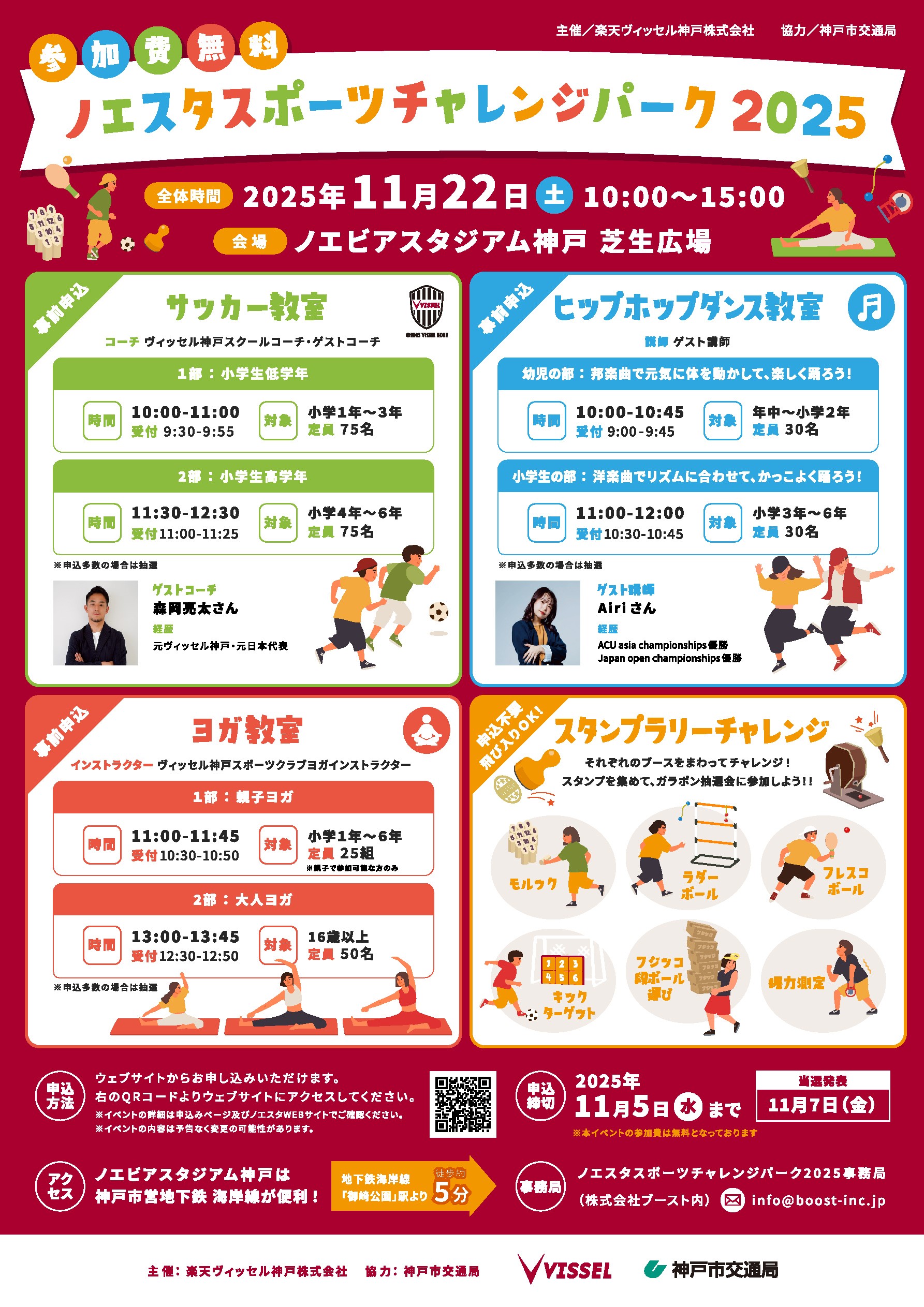 ヴィッセル神戸が主催する家族向けイベントで、音楽・スポーツ・グルメ・防災体験など多彩な企画が一日を通して楽しめます。