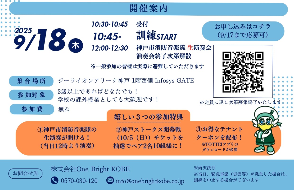 参加費は無料で、神戸市消防音楽隊の生演奏や神戸ストークス開幕戦ペアチケット抽選など特典も盛りだくさん。