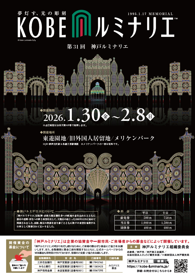 第31回となる今回は、「神戸の鼓動、光の物語」を作品テーマに掲げ、神戸ルミナリエとともにまちを歩き、感じ、つながる企画が展開されます。3つのメイン会場をはじめ、神戸ならではの景色が広がる各所にも小作品を設置。まちを巡りながら光の物語に触れることで、訪れる人々が神戸の多彩な魅力を再発見し、地域とのつながりを感じられる作品構成となります。