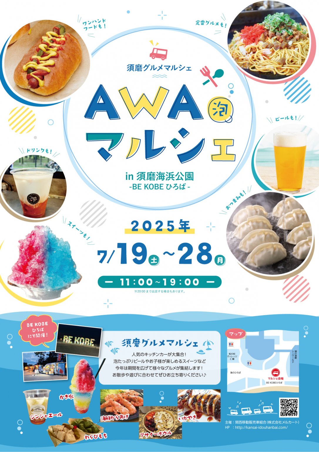 こちらの公園で、関西移動販売車組合のキッチンカーによる海&夏にぴったりなグルメイベント「泡マルシェ」が今年も開催されます。