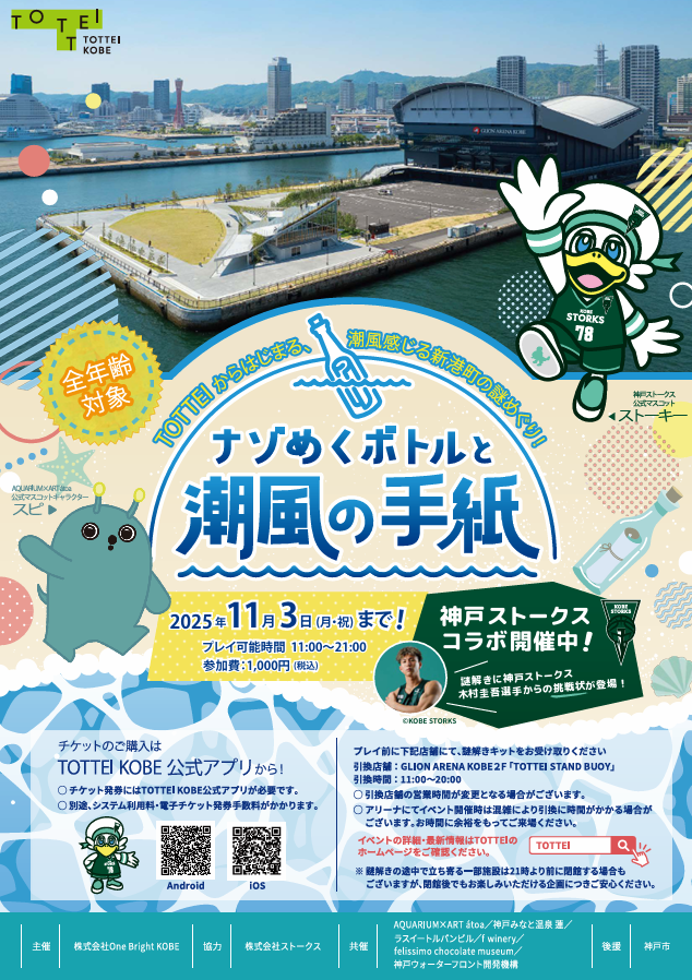TOTTEIからスタートし、新港町の神戸ウォーターフロントエリアの各施設をめぐりながら、B.LEAGE所属のプロバスケットボールチーム「神戸ストークス」のマスコット「ストーキー」と AQUARIUM×ART átoa 公式マスコット「スピ」と一緒に謎を解く体験型イベントです。