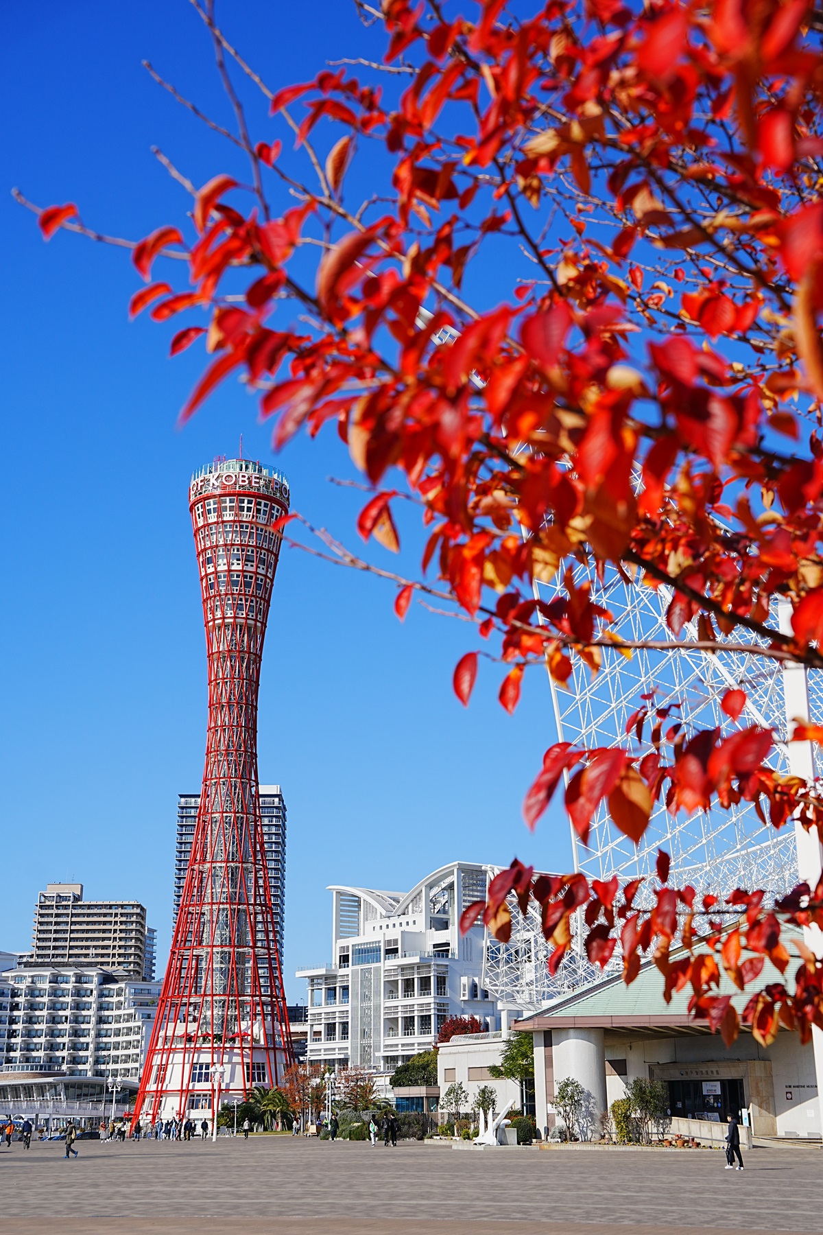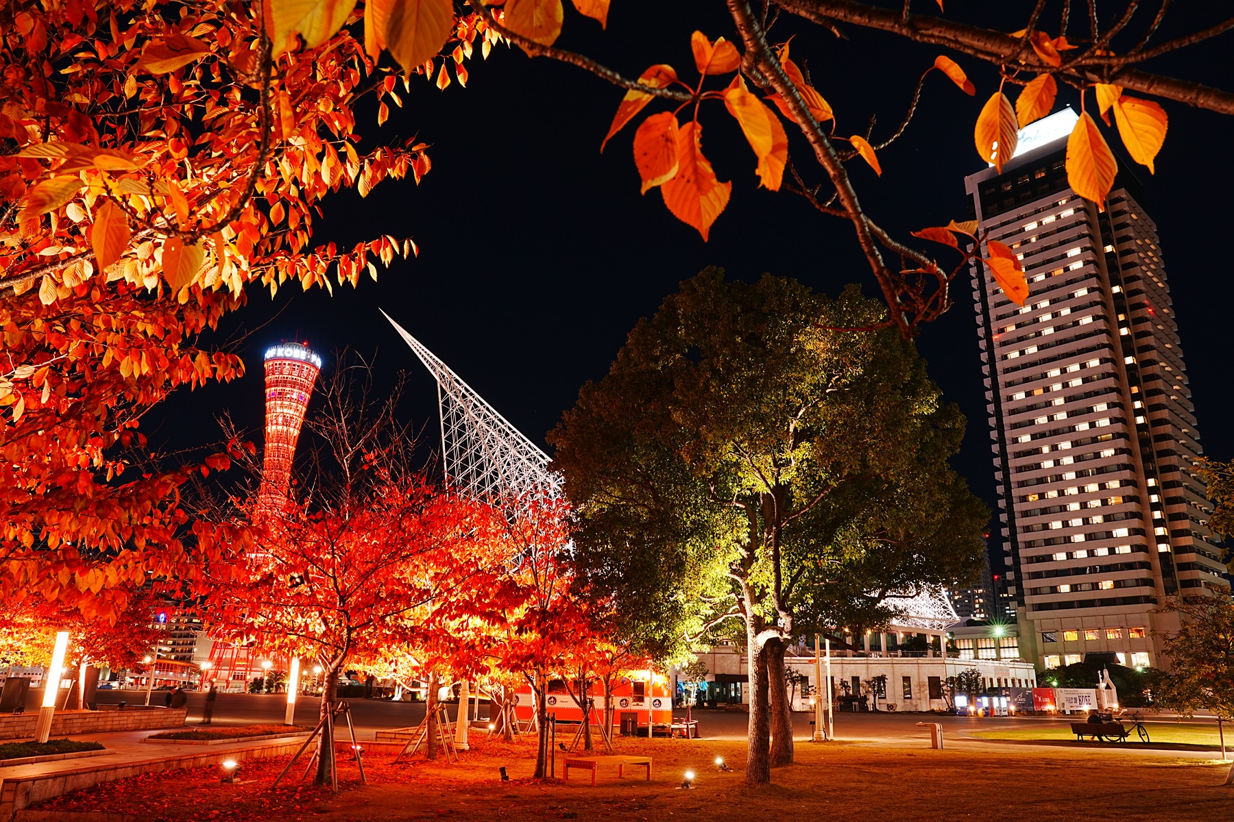 昼は青空と紅葉のコントラスト、夜はライトアップとポートタワーの光が織りなす幻想的な景色が広がります。