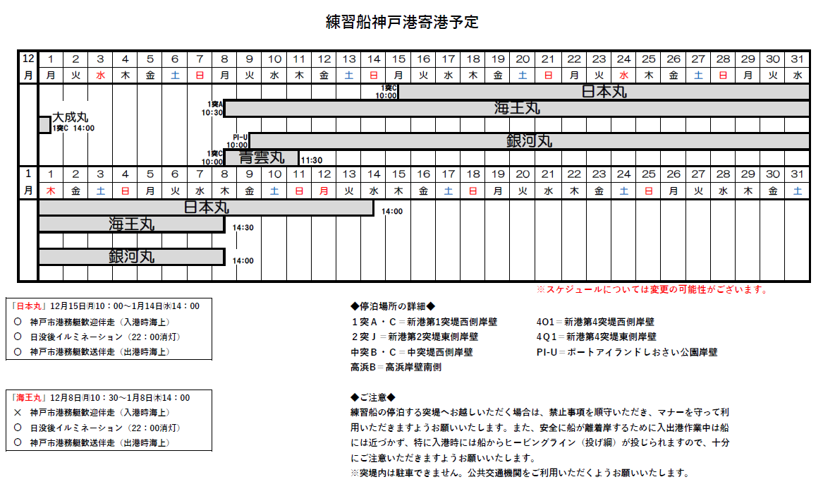 練習船神戸港寄港予定 (2025年12月・2026年1月)