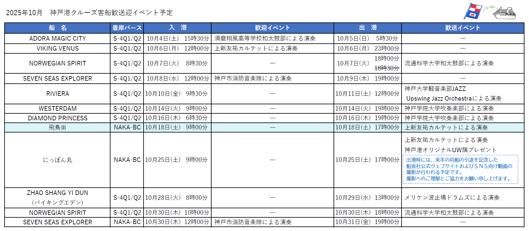 ⚓10/18「飛鳥Ⅲ」の歓送イベントを追加しました。(2025.10.10更新)